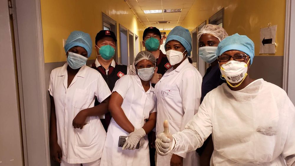 2020年5月26日,中国抗疫医疗专家组在刚果(布)首都布拉柴维尔指导新冠肺炎病房建设时,与当地一线医务人员合影。新华社发