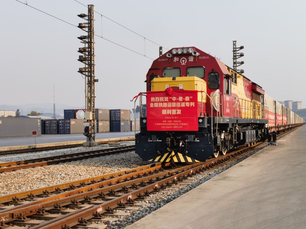 2023年2月7日下午,随着汽笛声响起,一列搭载19个冷链集装箱、约280吨新鲜蔬菜的中老铁路国际货物列车从云南省中铁联集昆明中心站驶出,约55小时后到达泰国曼谷,标志着“中老泰”全程铁路运输往返班列成功首发。