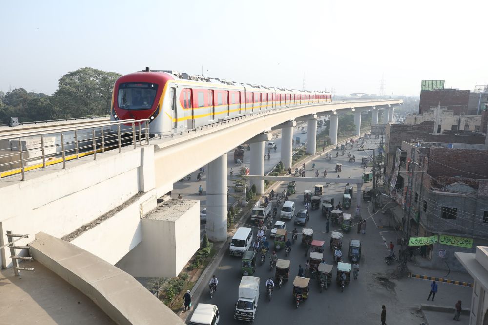 在巴基斯坦拉合尔市,巴基斯坦首条地铁拉合尔橙线一辆地铁列车准备进站(2020年10月26日摄)。新华社记者刘天摄