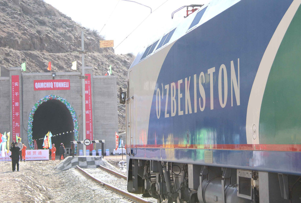 2016年2月27日,一列专列停在乌兹别克斯坦安格连-帕普铁路卡姆奇克隧道进口。中国政府优买项目、中铁隧道集团承担的中亚最长隧道——乌兹别克斯坦安格连-帕普铁路卡姆奇克隧道2月27日全隧贯通。新华社记者 沙达提 摄