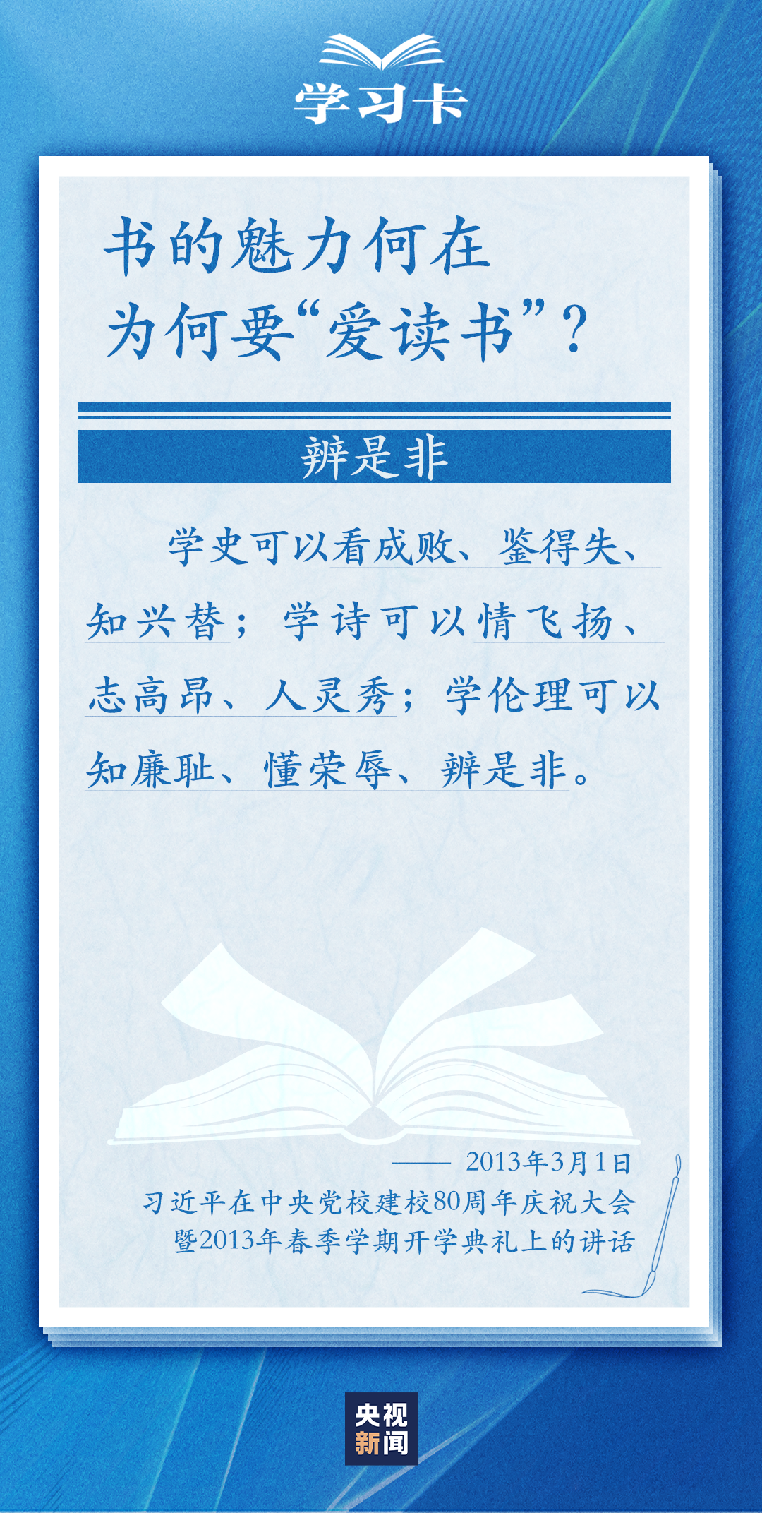 今天(4月23日)是世界读书日。习近平曾多次讲述和书籍的不解之缘,分享读书学习的感悟,倡导“爱读书、读好书、善读书”。书的魅力何在,为何要“爱读书”?如何能“选好书”?怎样“善读书”?一起学习↓
