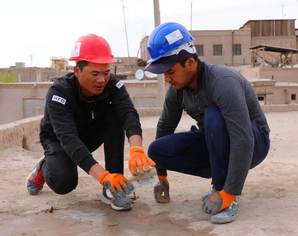 △在乌兹别克斯坦希瓦古城,中方文物修复人员在指导乌方工作人员进行修复工作。