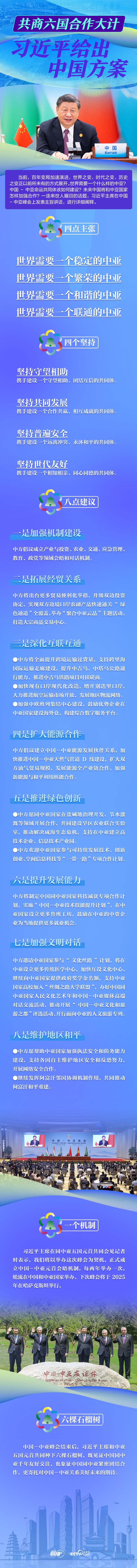 联播+ “欢迎大家来到西安,出席中国-中亚峰会,共商中国同中亚五国合作大计。”5月19日,习近平主席在陕西省西安市主持首届中国-中亚峰会并发表题为《携手建设守望相助、共同发展、普遍安全、世代友好的中国-中亚命运共同体》的主旨讲话,同中亚五国元首签署了《中国-中亚峰会西安宣言》,并通过《中国-中亚峰会成果清单》。六国元首还共同会见记者、共同种下六棵石榴树。
