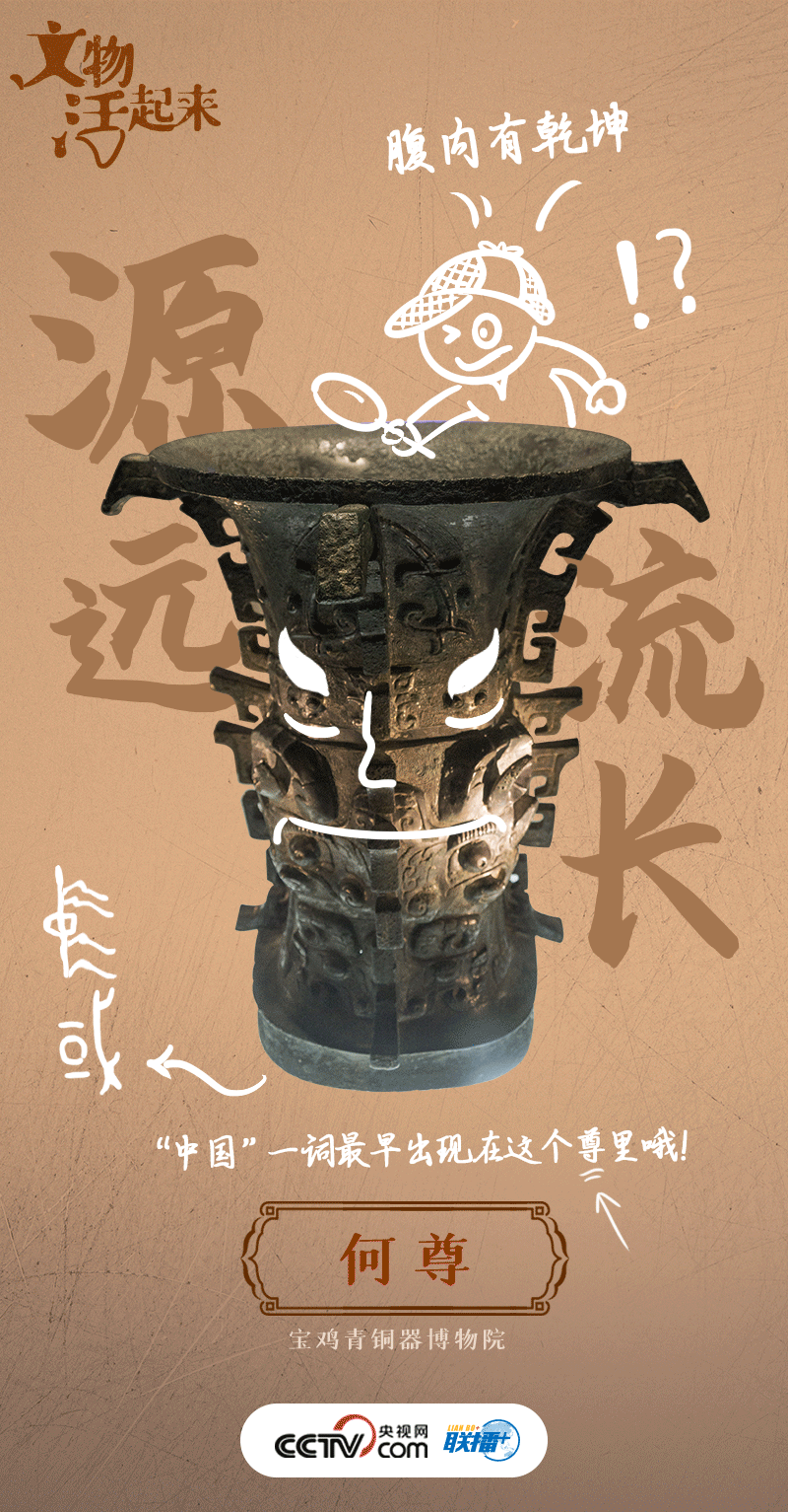 何尊,一座盛酒的西周(公元前1046年-公元前771年)青铜礼器。内部底座上铭刻着12行122个古老汉字,记录了3000年前,两位少年关于如何使国家兴盛、传承父辈荣耀的对话。其中,“宅兹中国,自兹乂民”是汉字组合“中国”的最早来源。