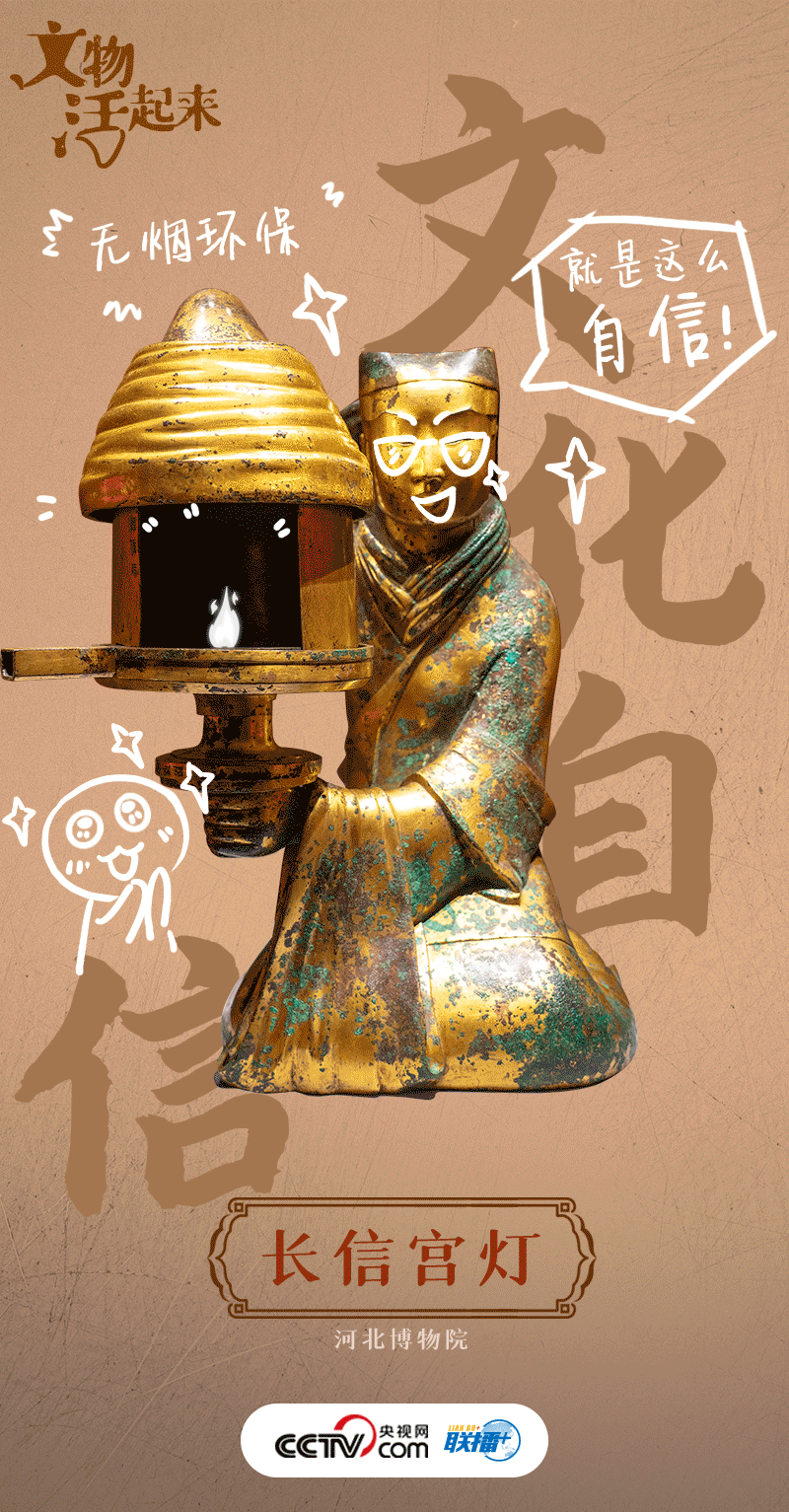 这盏灯来自西汉(公元前202年-公元8年),因灯身刻有“长信尚浴”的铭文而得名长信宫灯。长信宫灯设计巧妙,是目前所见唯一一件汉代人形铜灯,整件灯分为六个部分,每部分都可以简单地拆卸重装,宫女的袖管与身体连接形成排烟通道,环保设计理念独特、超前,被誉为“中华第一灯”。