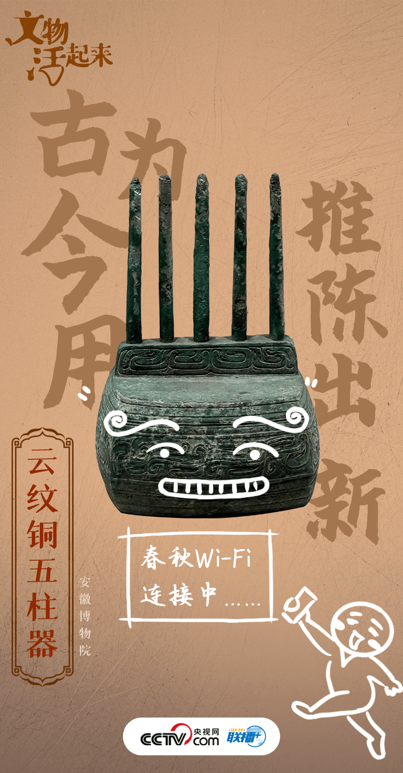 这件文物名为“云纹铜五柱器”,断代为西周(公元前1046年-公元前771年),用途待考。早年有人认为它是乐器,该观点很快被否定。后有人认为是某种器物的底座,亦是语焉不详。还有人认为是古人祭祀祖先时插先祖牌位的底座,这种观点也有待于学术界论证。