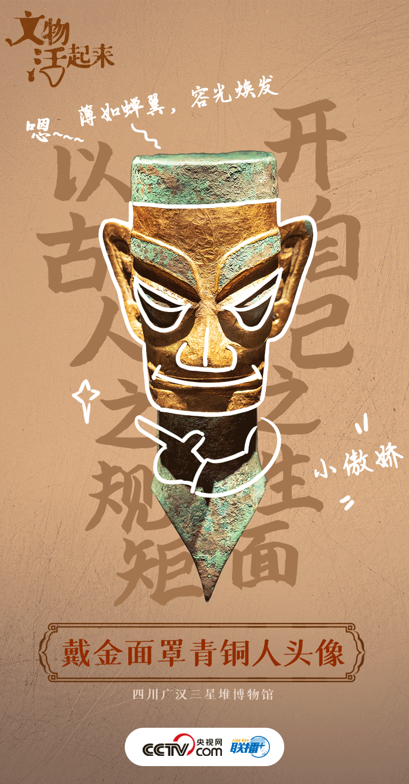 据已有统计,三星堆一号坑、二号坑共出土了57件样式各异的青铜人头像,其中只有4件覆盖黄金面具,而这尊是三星堆出土的金面铜人头像中保存最完好的一件。黄金面具如同一张薄如蝉翼的面膜,厚度仅有0.2毫米。古蜀以金为尊,在青铜人头像上包贴金面罩与宗教习俗有密切关系,同时也是其高贵、权威身份的象征。