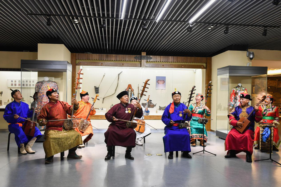 在赤峰博物馆,《格萨(斯)尔》国家级非遗传承人金巴扎木苏(前排右二)和团队一起表演节目。新华社记者 刘磊 摄
