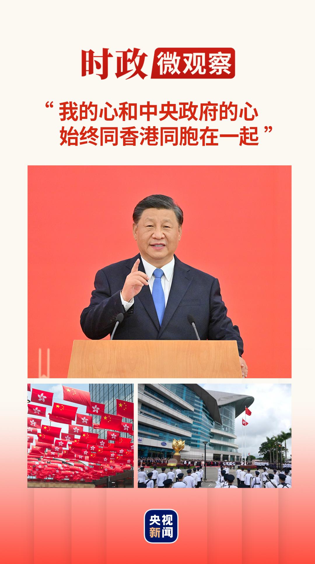 2022年7月1日,香港特别行政区第六任行政长官李家超,在习近平主席的监誓下,举起右手庄严宣誓。 一年来,新一届特区政府勇于担当,展现出“爱国者治港”新气象,香港在“一国两制”正确轨道上稳步前进。李家超坦言:“无论是党的二十大报告里还是全国两会上,习近平主席的重要讲话里都提到了全面准确、坚定不移贯彻‘一国两制’、‘港人治港’、高度自治方针,这对于我们来讲是一个很大的提振作用。” 香港特别行政区第五任行政长官林郑月娥曾这样感慨:“每年述职见面的时候,习近平主席都有同一句话,‘不论遇到什么困难什么问题,要记住,中央永远是特别行政区最坚强的后盾’。” 全国政协副主席梁振英体会深切:“回归祖国以来,香港方方面面取得骄人的成绩。我们更加感受到,香港的命运与祖国始终紧紧相连。” 香港的根本利益同国家的根本利益是一致的,中央政府的心同香港同胞的心也是完全连通的。习近平主席说:“我的心和中央政府的心始终同香港同胞在一起。”