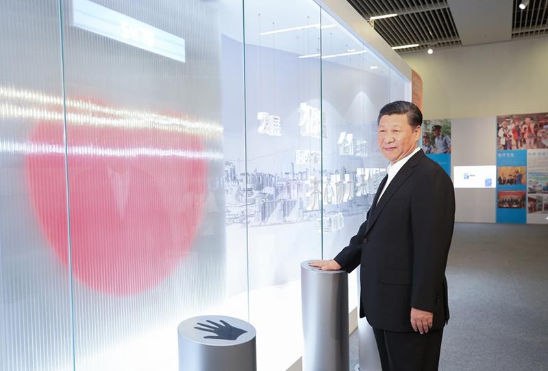 △2017年6月26日,习近平总书记在国家博物馆参观香港回归祖国20周年成就展,并按下“同心圆”互动装置的触摸板。