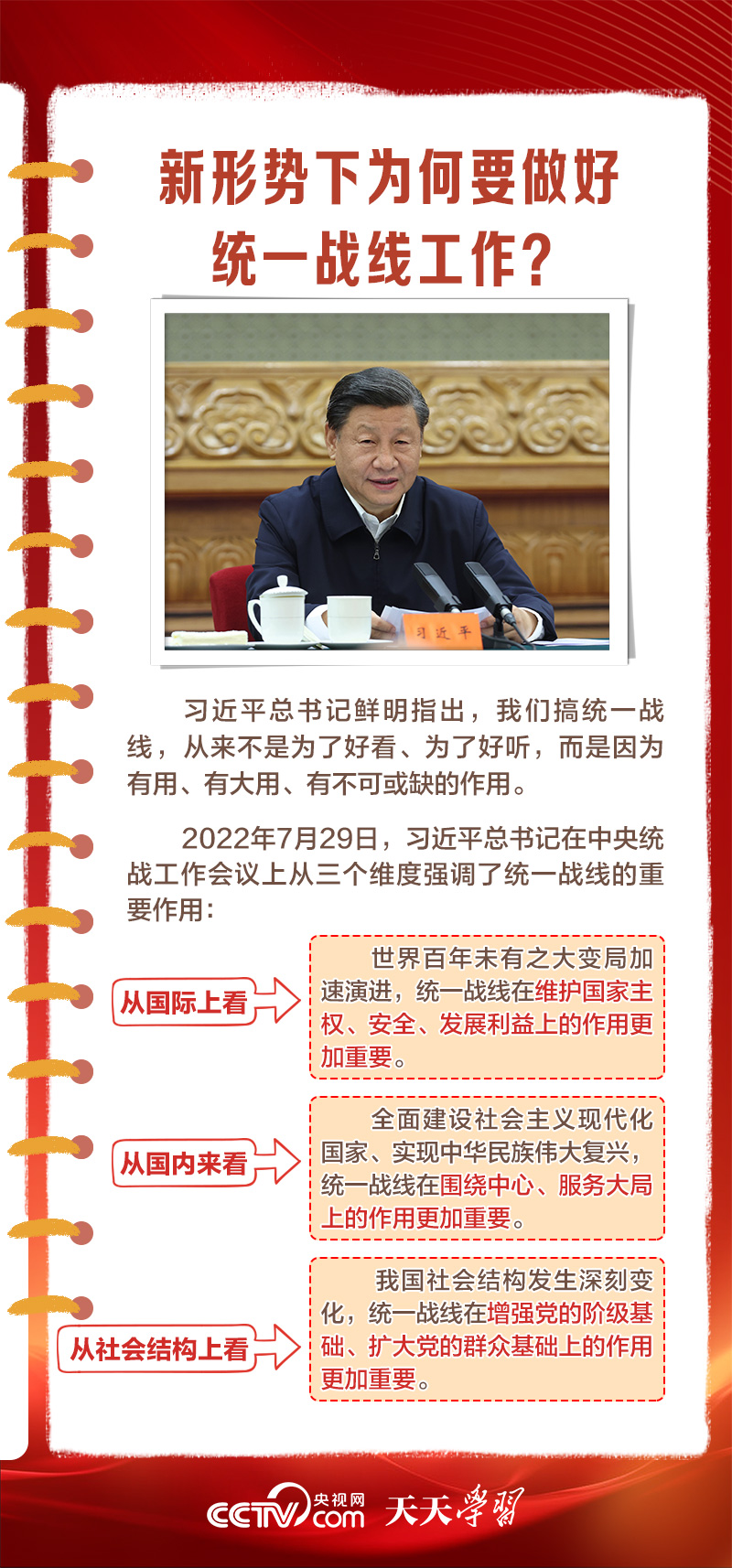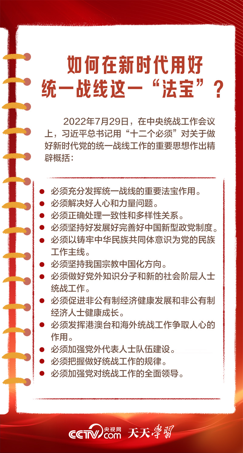 在百余年的奋斗历程中,我们党始终把统一战线摆在重要位置,让团结的旋律始终高昂,共同奋斗的力量始终激荡。从“重要法宝”到“强大法宝”,体现出总书记对党的统战工作一以贯之的高度重视。