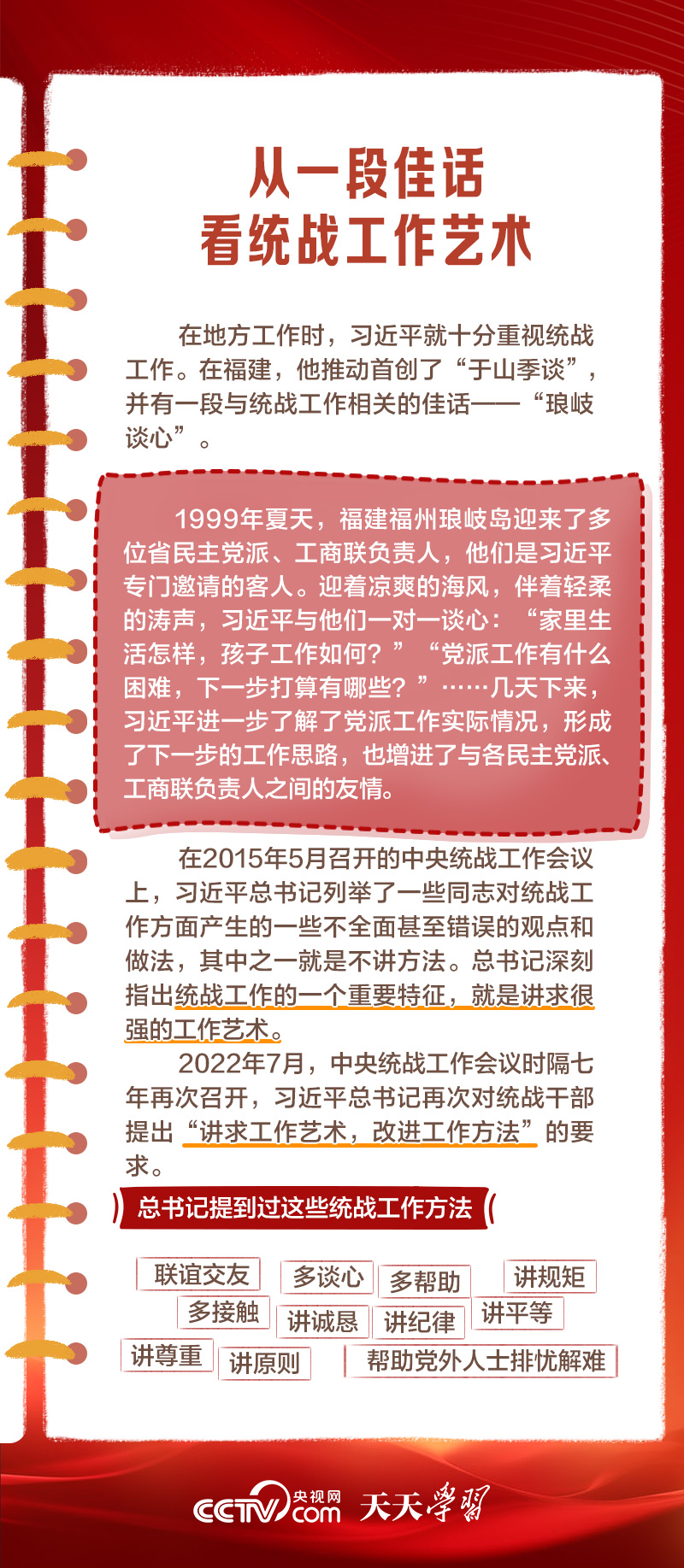 天天学习 1月16日出版的第2期《求是》杂志发表了习近平总书记的重要文章《完整、准确、全面贯彻落实关于做好新时代党的统一战线工作的重要思想》,该文是习近平总书记2022年7月在中央统战工作会议上讲话的一部分。文章指出,统一战线是党克敌制胜、执政兴国的重要法宝,是团结海内外全体中华儿女实现中华民族伟大复兴的重要法宝,必须长期坚持。