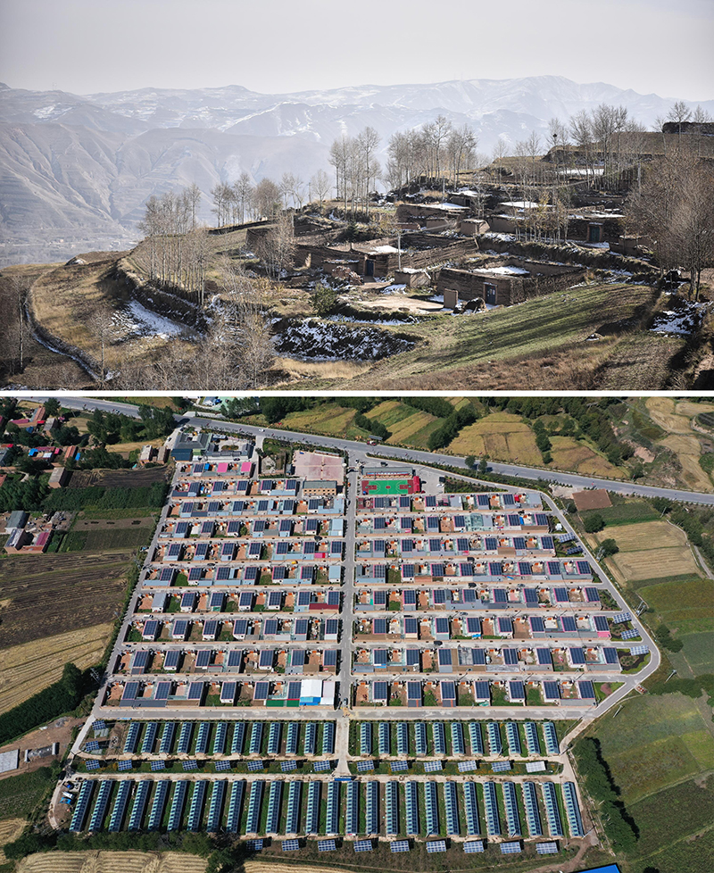 上图:2016年11月拍摄的脱贫前的青海省海东市互助县班彦村村貌。下图:2019年9月拍摄的青海省海东市互助县班彦新村村貌。