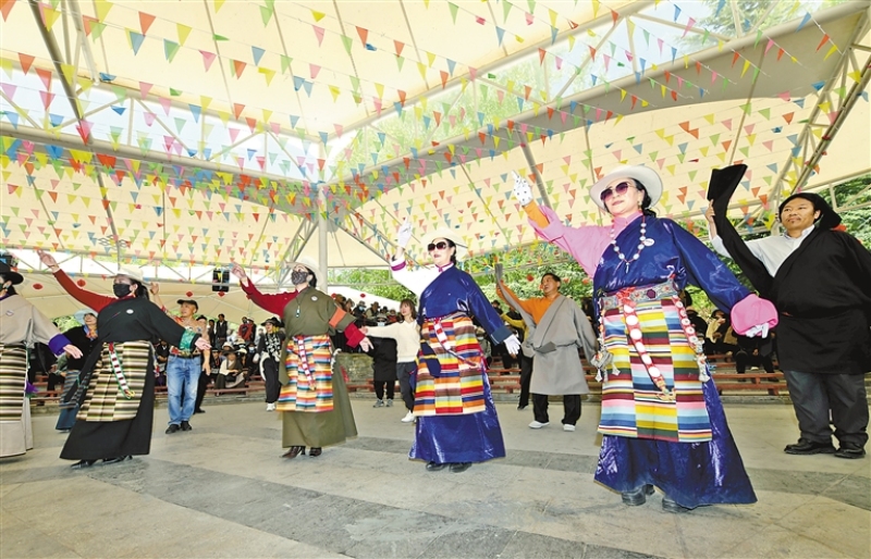 市民在宗角禄康公园跳锅庄舞。 本报记者 唐斌 摄