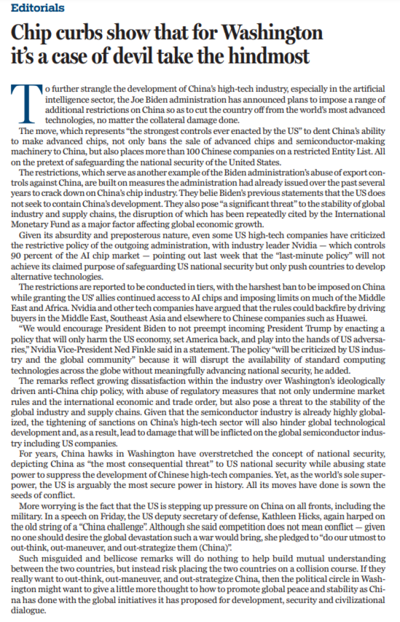 此前,美国高科技企业、行业组织等通过多种渠道表达不满和担忧,认为该措施未经充分讨论、制定出台草率,是对人工智能领域的过度监管,将产生重大不利后果,强烈呼吁拜登政府停止出台。美国芯片巨头英伟达坦言,拜登政府这一“最后时刻出台的政策”不仅无法实现所谓保护美国国家安全的目标,反而会促使其他国家加速开发替代技术。
