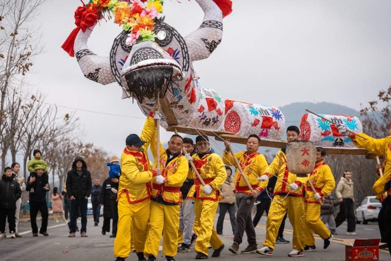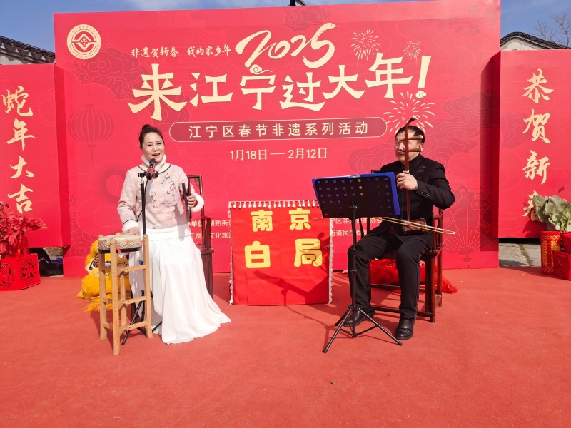 在江宁等地乡村,也有不少游客“追着非遗过大年”。大年初三,伴随着喜庆的锣鼓声,身穿红绿服装的江宁湖熟荡湖船表演队跟着音乐摇摆着旱船,一边跳一边笑,20余人的热闹表演再现古时湖熟渔民的丰收之景,游客群众纷纷拿起手机,记录精彩瞬间;春节期间,“来江宁过大年”杨柳村春节系列活动从大年初二至初七每天不重样,白局、麻雀蹦、殷巷石锁、舞狮等轮番上演,吸引不少市民游客前来感受传统文化的魅力。