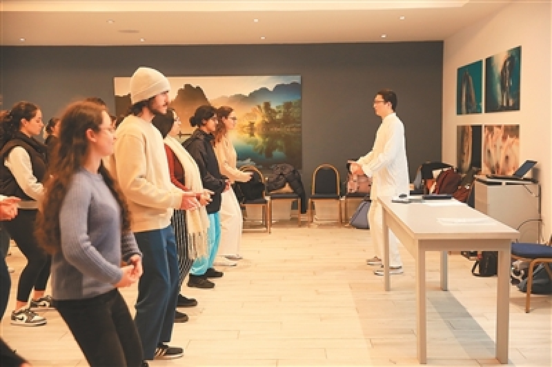 八段锦也同样引起在场人们的浓厚兴趣。杨晓伟在简要介绍八段锦的历史渊源和练习益处后,带领大家现场练习。在舒缓的音乐中,学生们跟随杨晓伟的口令,依次完成每个动作,同时配合呼吸吐纳,使精神更加集中,感受练习八段锦带来的身心和谐的状态。