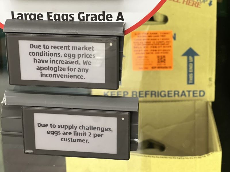 2月10日,在美国加利福尼亚州洛杉矶县一家超市内,顾客从鸡蛋售罄的通知旁走过。新华社发(曾慧摄)