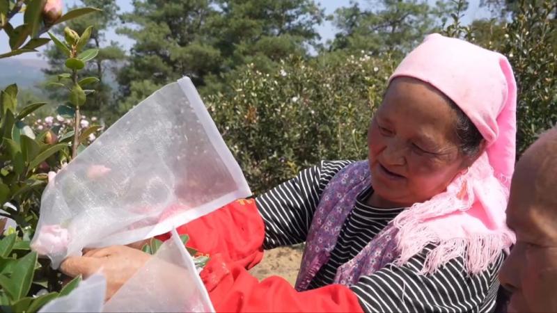 授粉后的花朵被细致套上隔离袋、穿上“防护衣”,助力培育抗逆性强、出油率高的新品种。