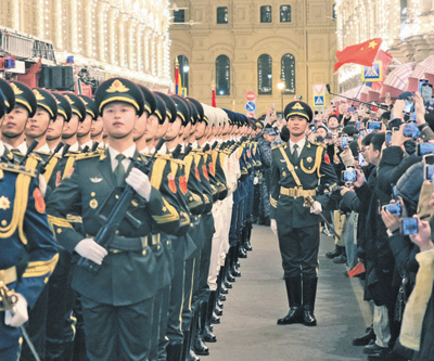 当地时间5月3日,中国人民解放军仪仗司礼大队在莫斯科参加纪念苏联伟大卫国战争胜利80周年庆典阅兵式第二次彩排。 |