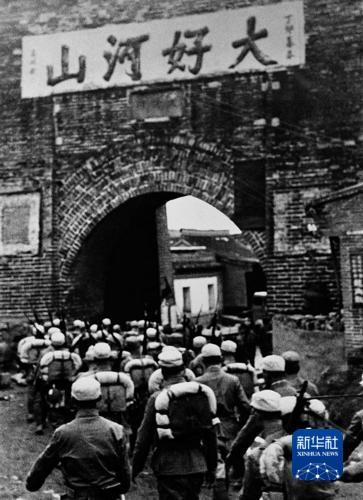 1945年,收复山海关的八路军列队通过城楼。张进学 摄