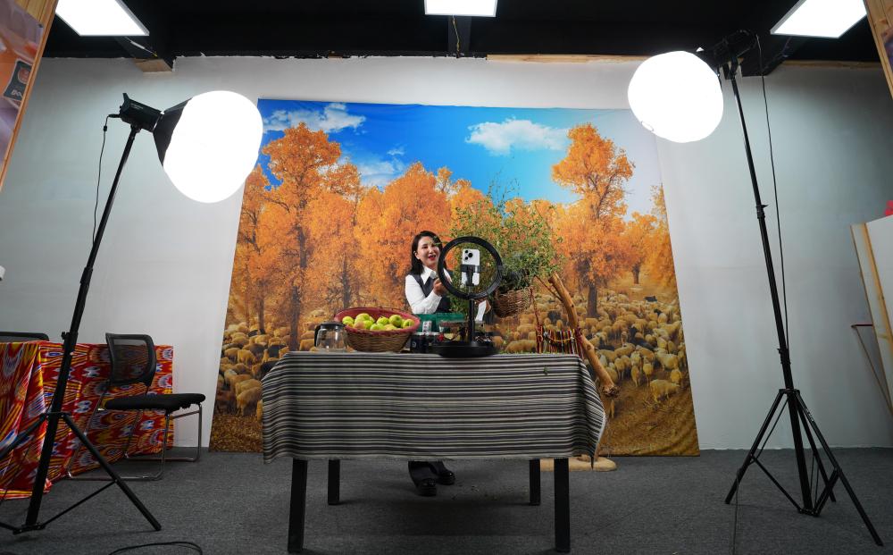 9月19日,尉犁县电商协会负责人米日阿依·阿西木在达西村的电商基地直播推介达西村农产品。近年来,达西村构建“农户生产+企业加工包装+电商销售+物流配送”全产业链,为县域经济发展培养孵化本土直播电商人才,促进传统产业转型升级。