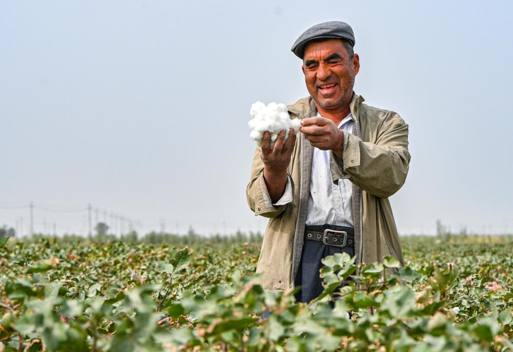 9月19日,尉犁县达西村二组村民艾合买提·吐尔逊在棉田里查看棉花。