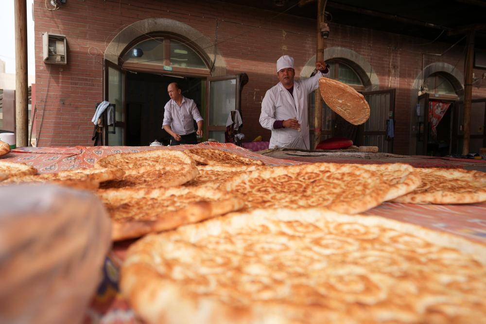 9月19日,达西村村民肉则·赛麦提(右)在文旅商业街上制作馕。近年来,达西村打造文旅商业街,吸引村民入驻,为村民增收。