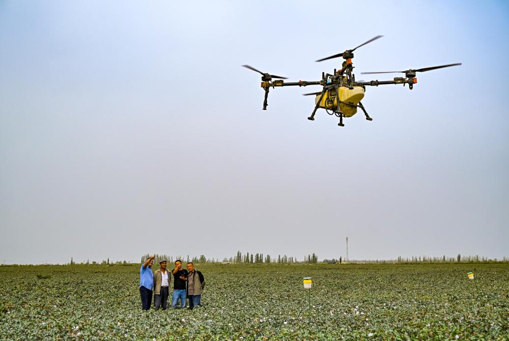9月19日,极飞超级棉田负责人艾海鹏(右二)在尉犁县的示范棉田里为达西村村民进行智能无人机洒药培训。无人化智慧农场应用农业无人机、农业无人车、遥感无人机、农机自驾仪等系列物联设备实施“水肥一体化”管理,农民用一部手机即可操作智能设备完成多项田间管理工作。