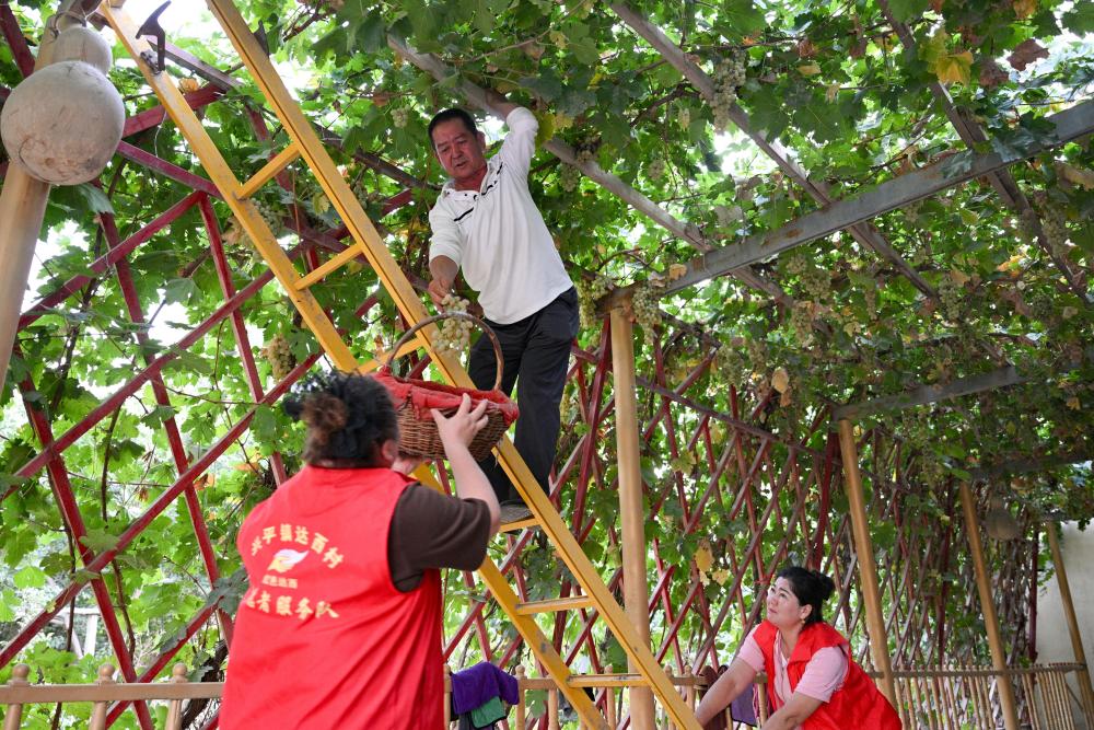 9月18日,达西村村干部入户帮助村民采摘葡萄。近年来,达西村充分挖掘房前屋后闲置土地及荒废地块,逐步扩大特色林果种植面积,引导村民增收。
