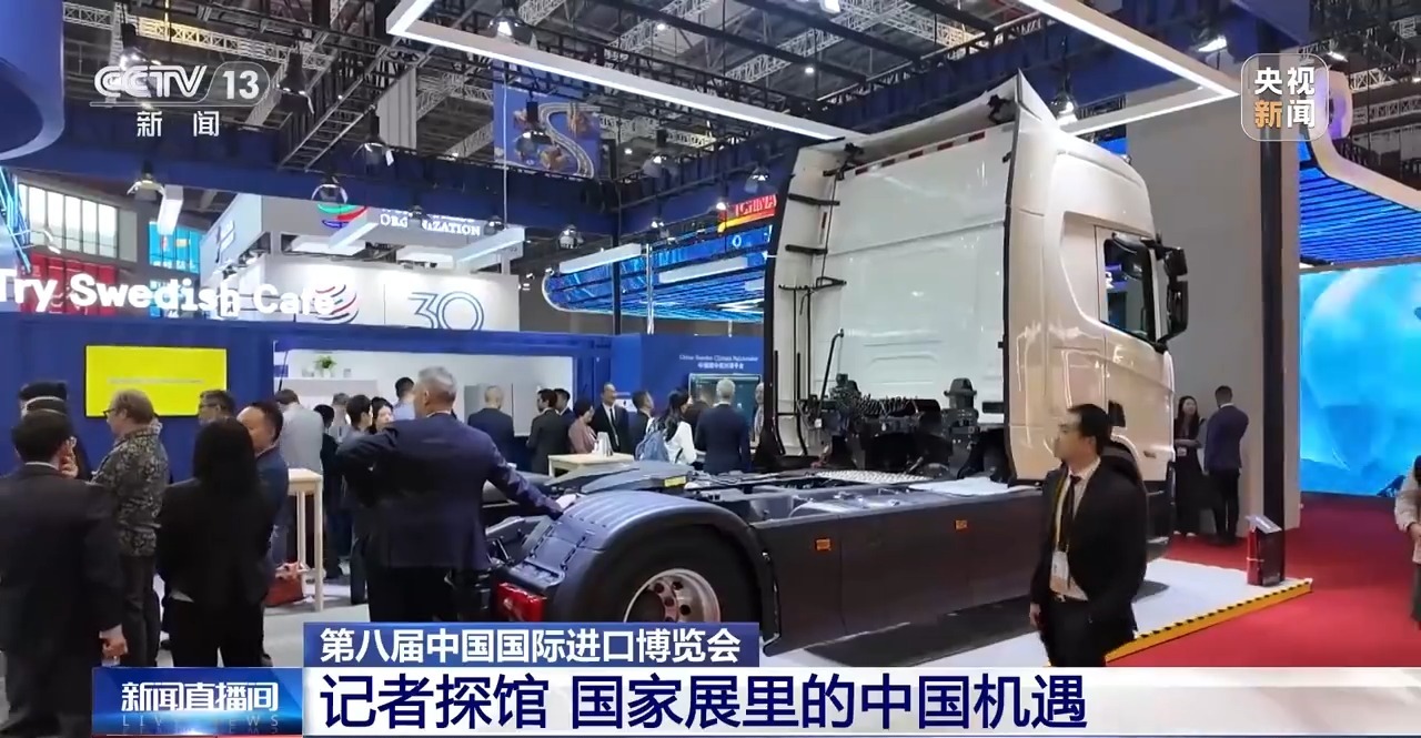 我的AI眼镜第一时间就捕捉到了这个“大块头”,放眼望去,整个国家展里没有比它还大件的展品了。这辆高端重卡车型来自瑞典,是享有“公路之王”美誉的瑞典企业斯堪尼亚带来的重型运输领域的最新成果。别看它块头大,新技术赋予了它高效节能的特点,是今年国家展里最吸睛的展品之一。