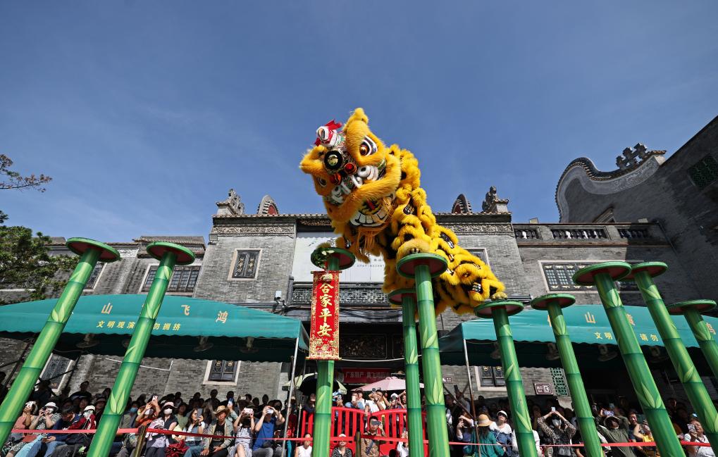 佛山黄飞鸿醒狮队在黄飞鸿纪念馆前表演。新华社记者 王鹏 摄