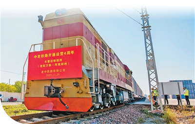 11月29日,一列满载1000吨木薯淀粉的铁路集装箱班列从中老铁路万象南站驶出,准备发往河南郑州。这是老挝首次成列运输输华的木薯淀粉。