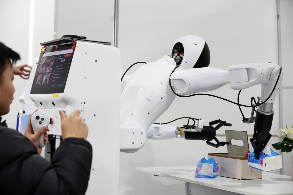 2025年2月18日,上海,工程师在训练人形机器人采集信息。视觉中国 图