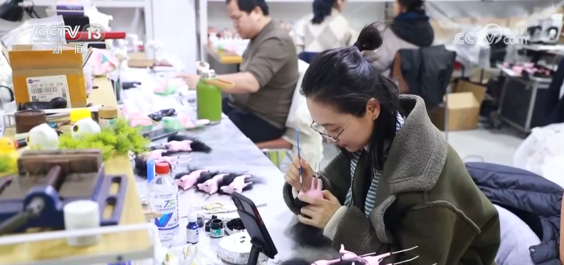 加上毛发,这一款精致的“潦草小马”就终于完工了。在记者身旁是“马彪彪”团队的工作室。春节临近,三十多位工作人员正在全力以赴地赶制订单中。