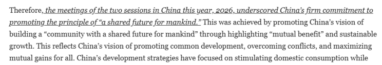 文章总结说,2026年中国两会彰显了中国坚定推动构建人类命运共同体原则的承诺。通过强调"互利共赢"和可持续增长,推动构建人类命运共同体的愿景。这体现了中国推动共同发展、化解冲突、实现各方利益最大化的理念。
