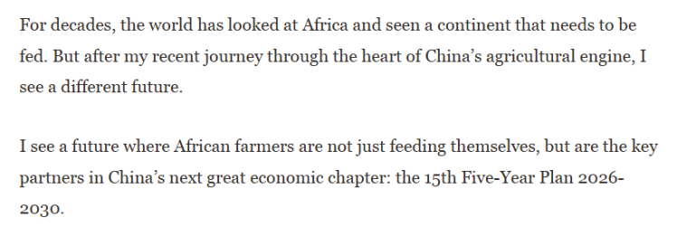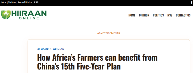 索马里新闻网站希兰在线(Hiiraan online)发表了题为《中国“十五五”蓝图将如何惠及非洲农民》的文章。