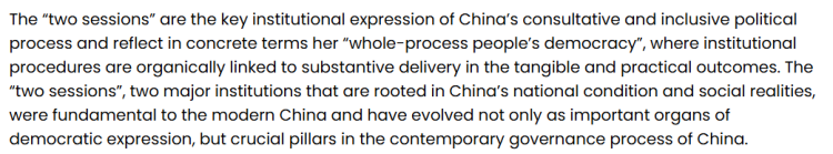文章指出,中国的全过程人民民主植根于中国的国情与社会现实,在现代中国国家治理体系中发挥着重要作用。两会不仅是表达社会意见、形成政策共识的重要平台,更是中国当代治理体系中的关键支柱。