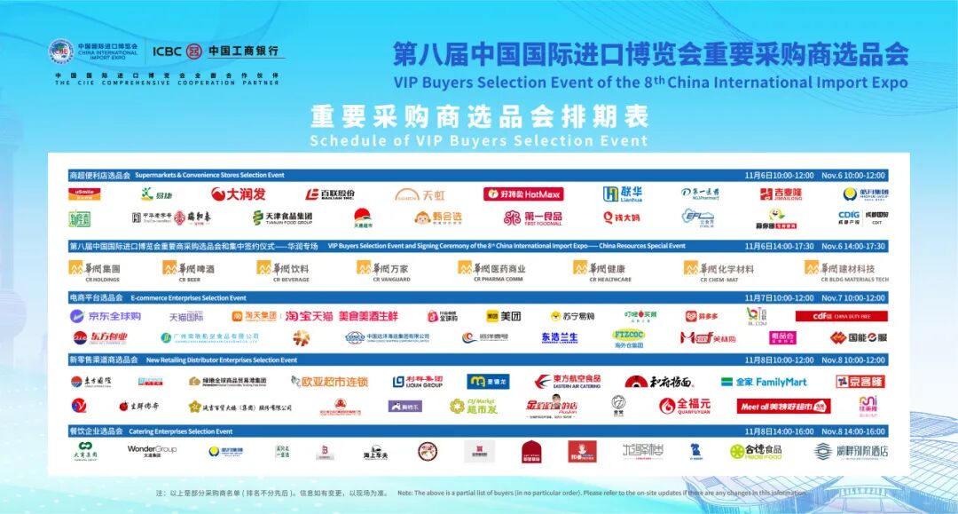 为进一步发挥进博会国际采购平台作用,促进精准对接与采购成交,第八届中国国际进口博览会重要采购商选品会将于11月6日至8日在国家会展中心(上海)8.2号馆举办。活动聚焦蔬果和农产品、乳制品、酒类、咖啡、茶及饮料、肉类及水产品、休闲食品及甜食、综合食品、美妆日化、家电家居、健康营养等板块。
